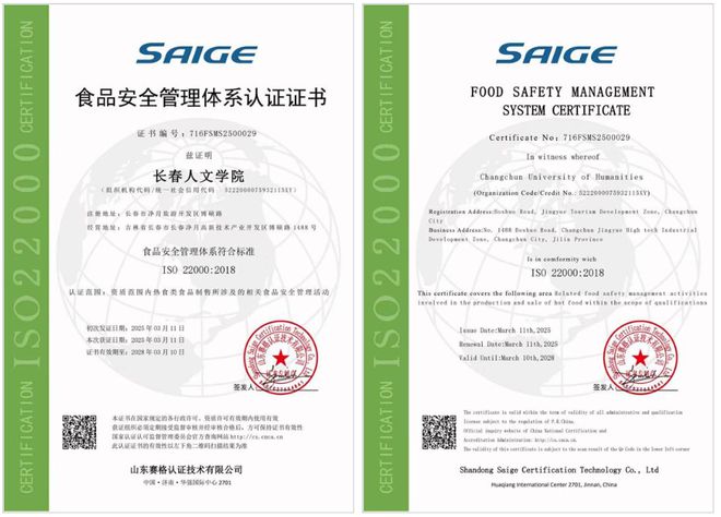 南宫NG28-长春人文学院食堂荣获ISO 22000食品安全管理体系认证